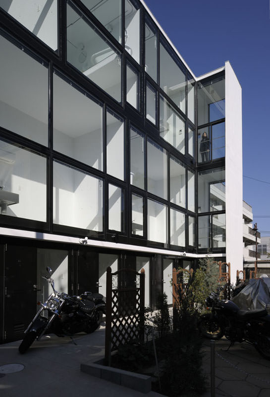 バイクガレージ付き集合住宅。住戸数7。建物前面に広がる住宅地、その向こうに見える新宿の高層ビル群への眺望を活かした構成。1階の天井高を低く抑え、2・3階の居室の天井高を3.4mにした。その高さを活かし、浴室を半階持ち上げている。その床下空間は、アイデア次第でさまざまに利用できる。