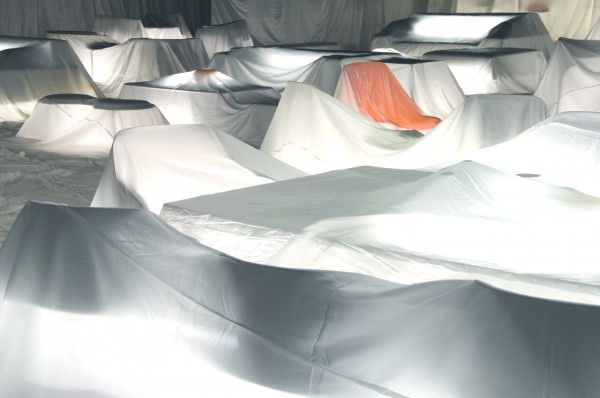 会場となった照明メーカーのショールームには、舞台セットのように家具や照明器具が展示されていた。それは都市生活のサンプリングされた断片的イメージである。その常套性と抽象性に巨大都市のリアリティを感じた。フロアー全体を大きな1枚の白い布で覆う。その下に天井からはずした照明器具を置く。光源はなく、明るさの強弱だけが漂う空間。